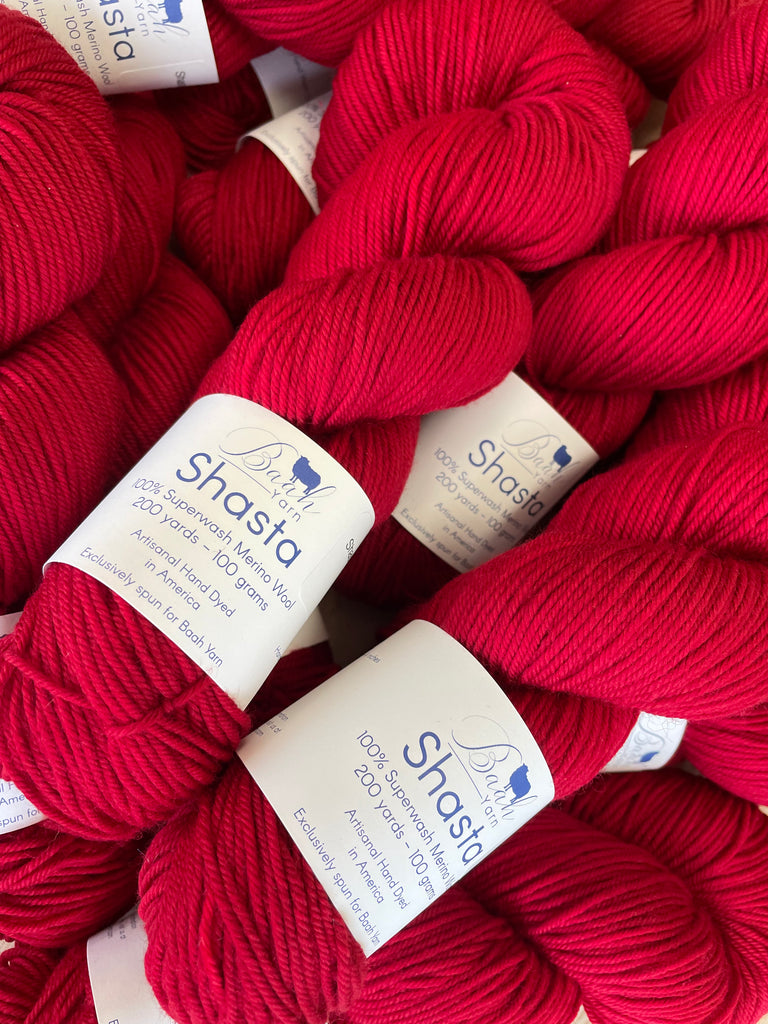 Baah Yarn Shasta is a worsted weight yarn made from 100% superwash merino wool. For best care, machine wash with cold water.